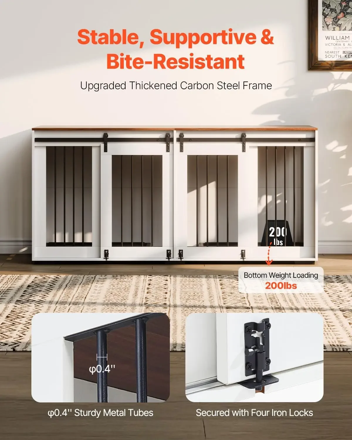 Welcome to Luxe Living Supply. Combine functionality and style with this spacious 72-inch double dog crate furniture, designed to comfortably house two dogs while doubling as a practical TV stand, entryway table, or buffet. Featuring smooth sliding doors for easy access, it provides a secure and cozy space for your pets. The sturdy construction ensures durability, while the removable components make cleaning and maintenance simple. Perfect for large dogs or multi-pet households, this furniture-style crate blends seamlessly with your home décor while offering a safe, comfortable environment for your pets.